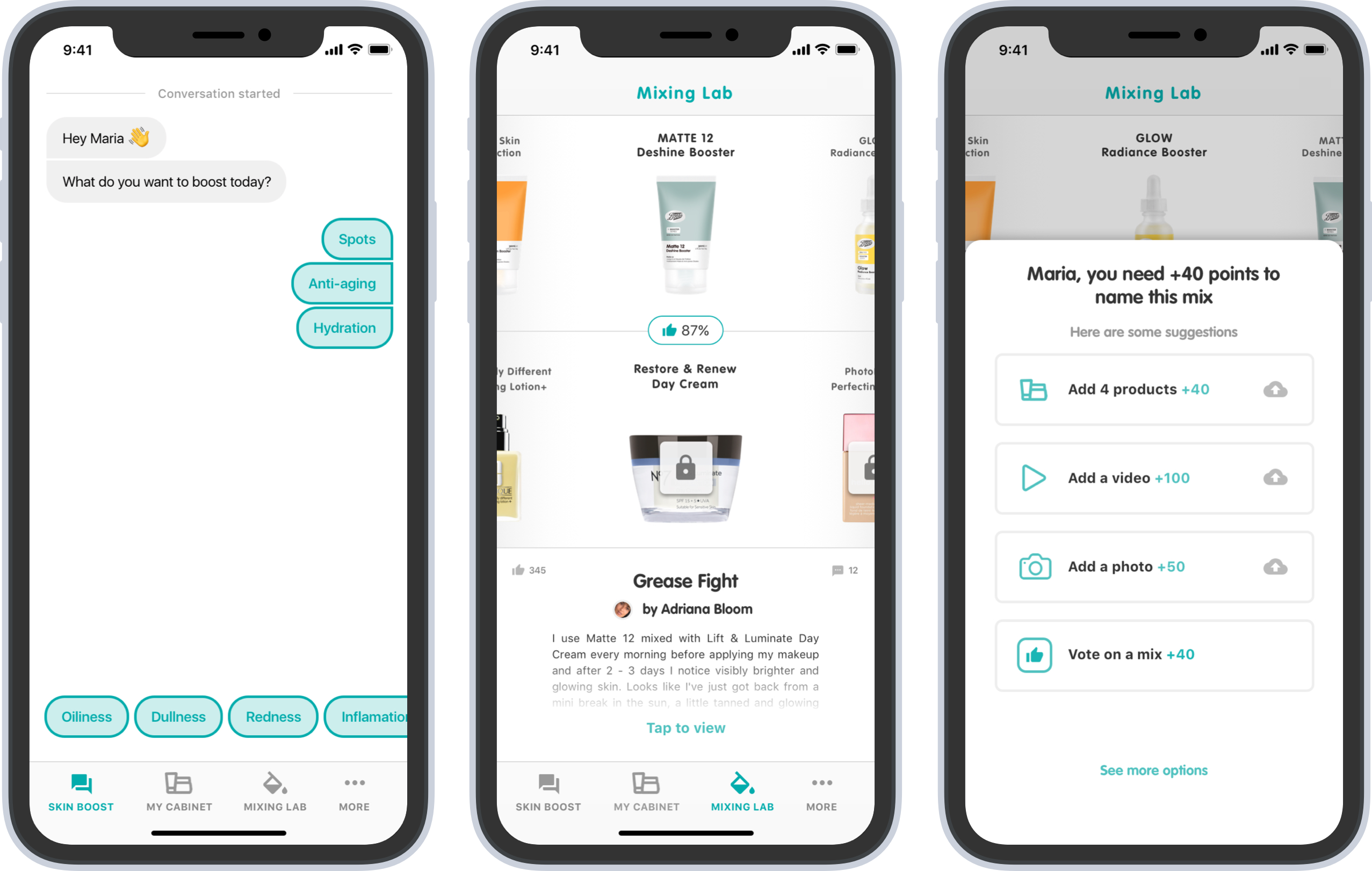 We created a diagnostics tool designed to provide the user with the correct Booster for their skin type. A 'cabinet' where users could pair a product they already own with a Booster which provided the opportunity to view other users’ comments and permanently name their own mix if they are the first do so. The final module within the app is one where users can view all the top-rated mixes, search and filter all combinations and if they see a mix they like then they can make in-app purchases via an 'unlock' button.