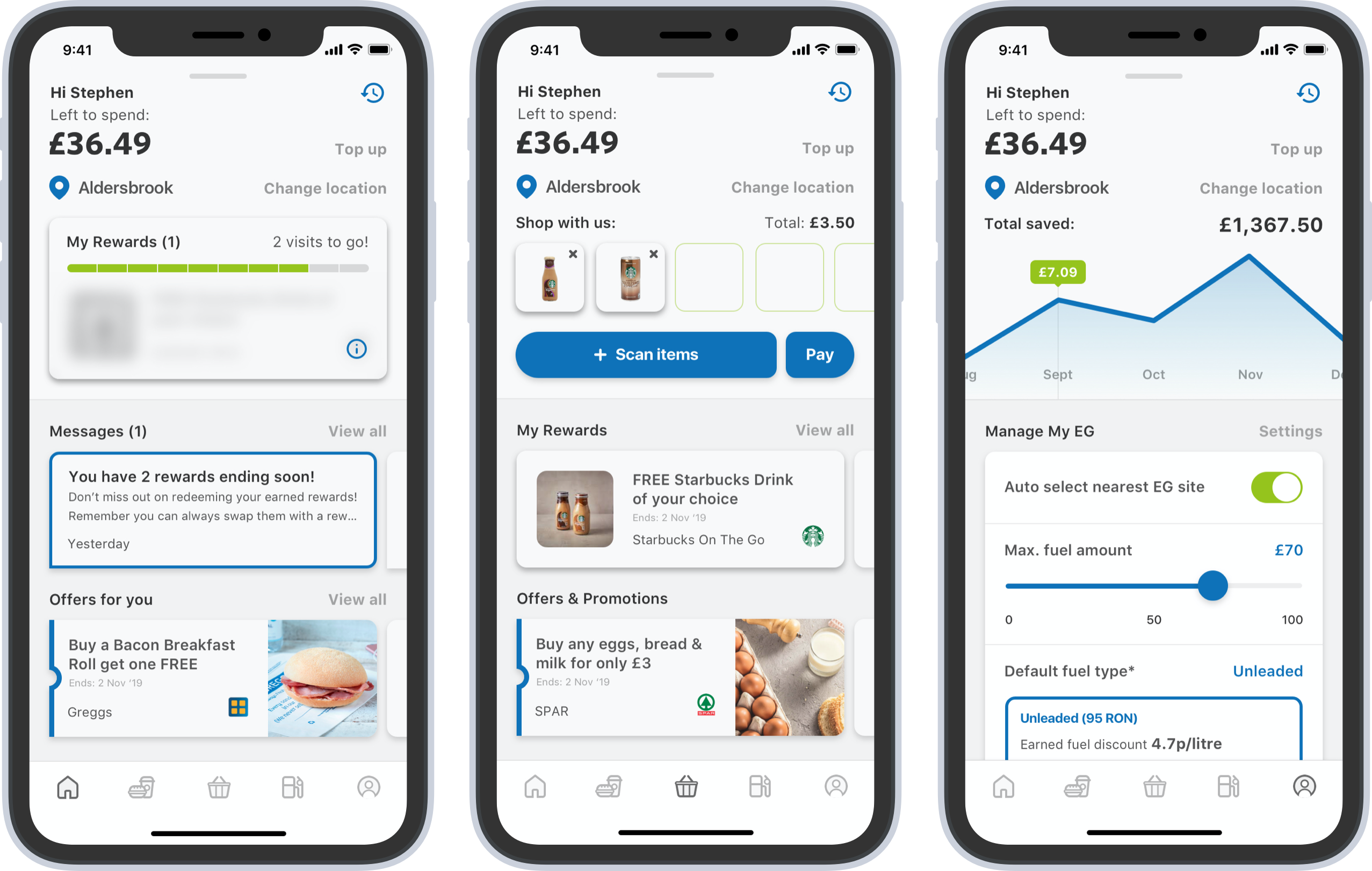 EG is a unique family run business who provide service stations, typically within towns and cities, housing many brand partners, for example, Starbucks, KFC, Esso and Shell. The challenge was to create an extension of this on-site experience (where users can pre-order food, scan and enter the shop, or pay for fuel at the pump) in a simple mobile app that provided loyalty across many of these brand partners who already have their own loyalty programs. This has never been done before in any loyalty app.
