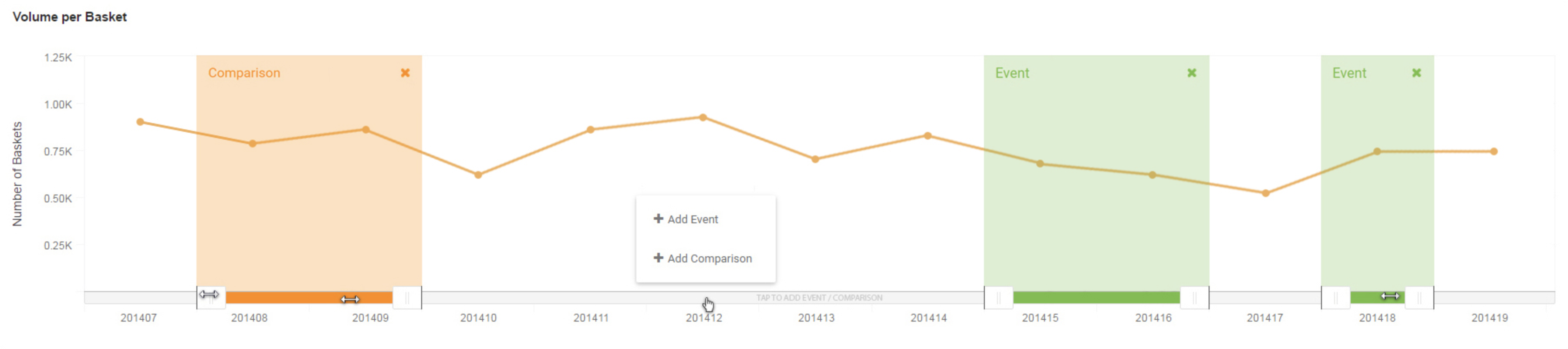 At SymphonyAI, I created many bespoke big data components using Highcharts, one which analysts liked was the in-chart time select slider which allowed them to select an 'event' and 'comparison' from within the chart. Prior to this, users needed to go to a menu or filters panel located elsewhere on the page. With the new design, they can see the piece of data they want to select and can select it directly from the chart. Before I created this, it was fiddly and time consuming for analysts to make these selections to complete a task.