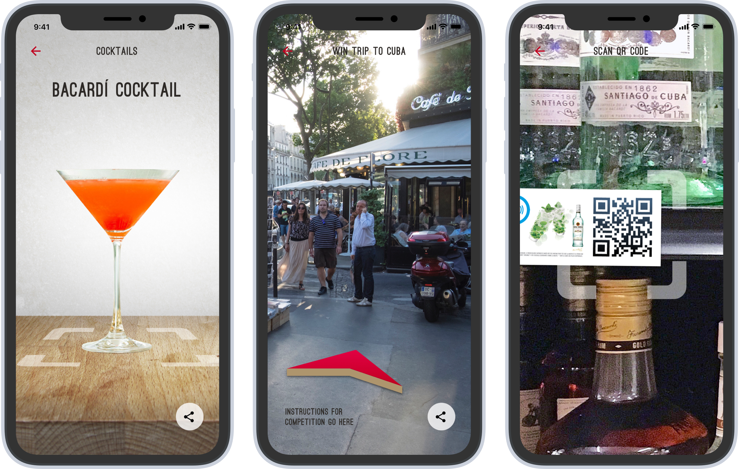 We exploited the potential for using augmented reality in an application using select game mechanics driving users to find out where they could buy Bacardi drinks, while also being able to compete against each other presented in a leaderboard to win a trip to Cuba. As an alternative to a standard menu, users could also use augmented reality to place a virtual cocktail on a table in front of them so they could so what popular cocktails that use Bacardi look like.
