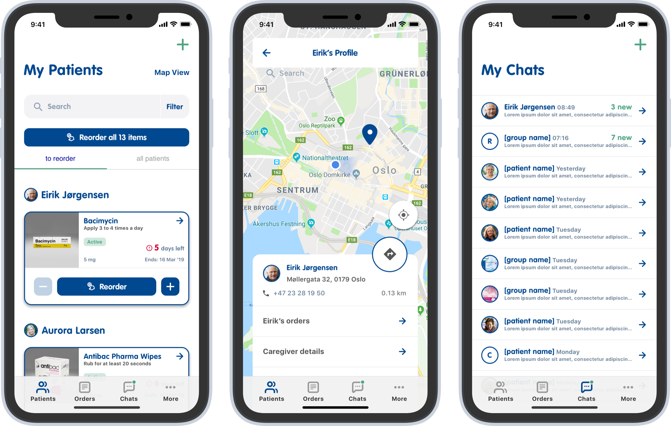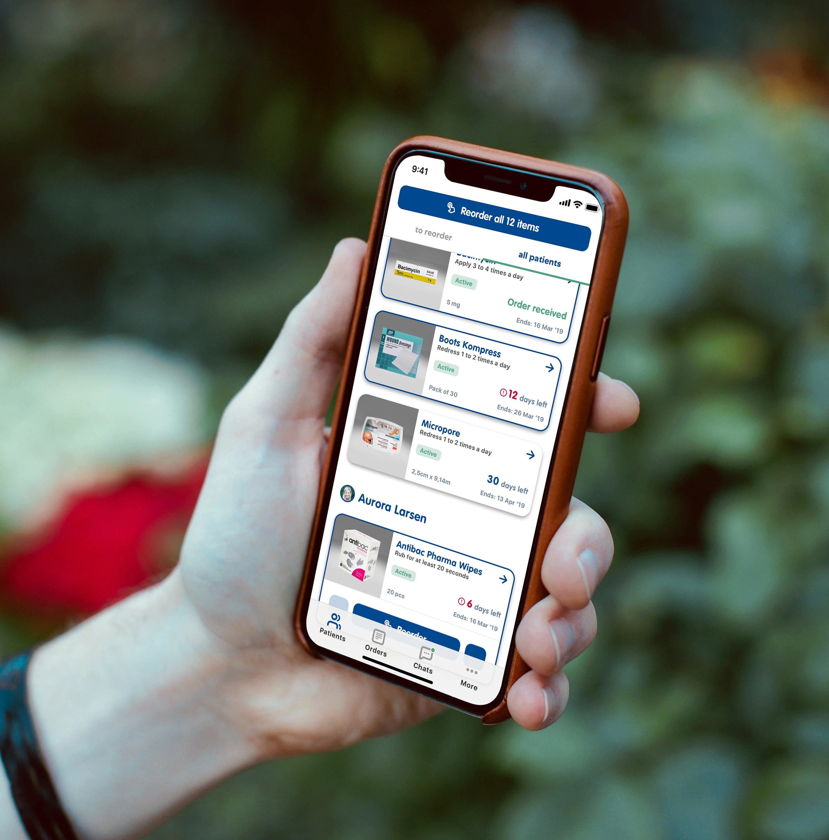 I worked remotely with the Boots Norway teams and began to wireframe, presenting to them each week on a call. Finally, we came up with a solution which I designed to be used with one hand, allowing carers to carry out main tasks like ordering medication for multiple patients with a big button in the middle of the screen with one tap. Carers can also chat with the patients or the caregiver via a WhatsApp like interface within the app.