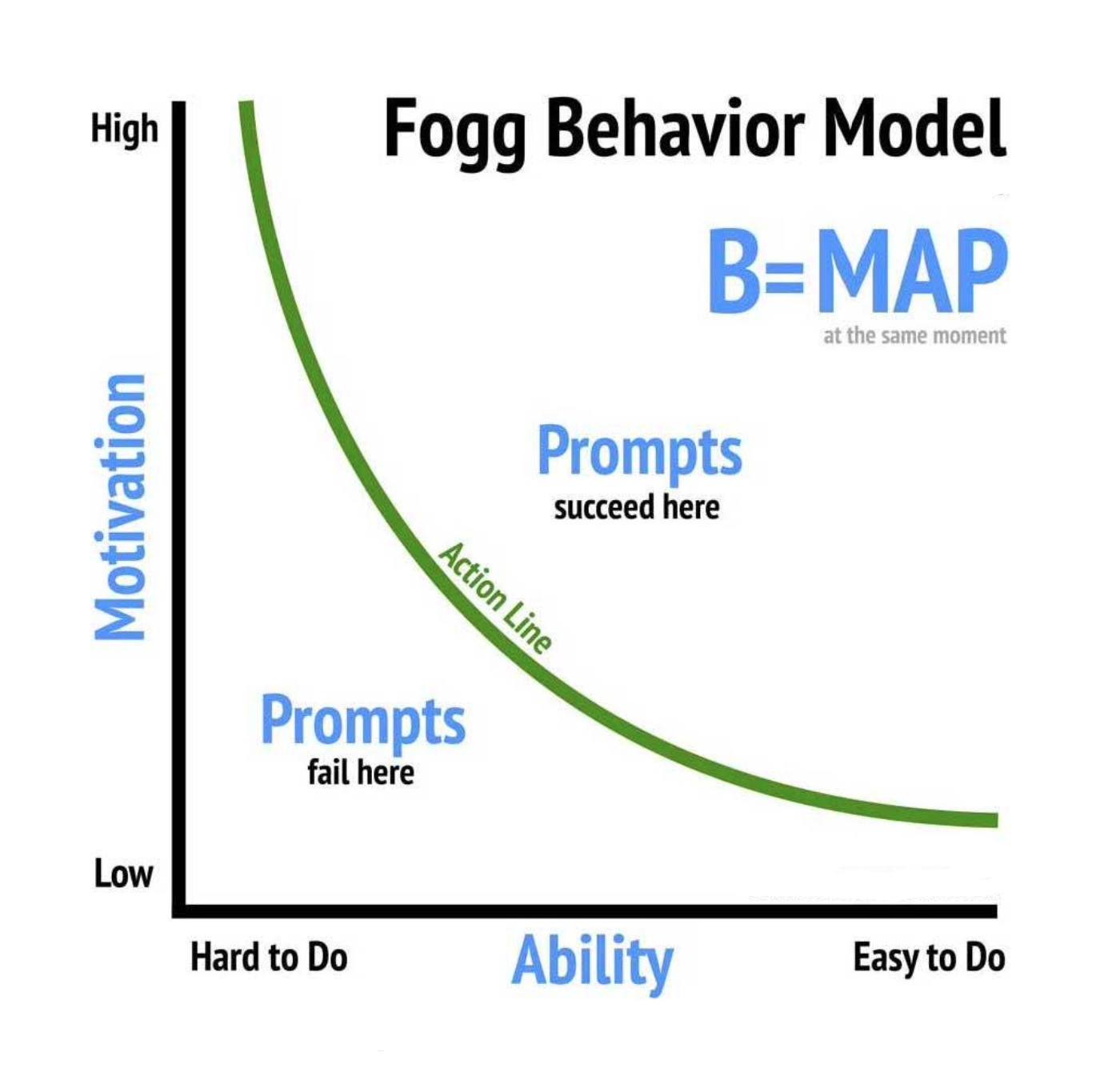 The aim of product design is to design triggers and prompts so they can be plotted in the upper right area of this model. For example, it’s okay if something is hard to do as there might be a good reason for it. Think Bloomberg Terminal. It’s hard for traders to use when they start their career, but their motivation to learn and use that platform is high, which would be plotted in the top left corner, to the right of the green action line. Another example would be an iPad app for a toddler or small child. The app would be easy for them to use and their motivation to use it would also be high, which would be plotted in the top right corner of the model, and so on. You need to make sure that what you design and build is quite literally going to get you over the line...the green line.
