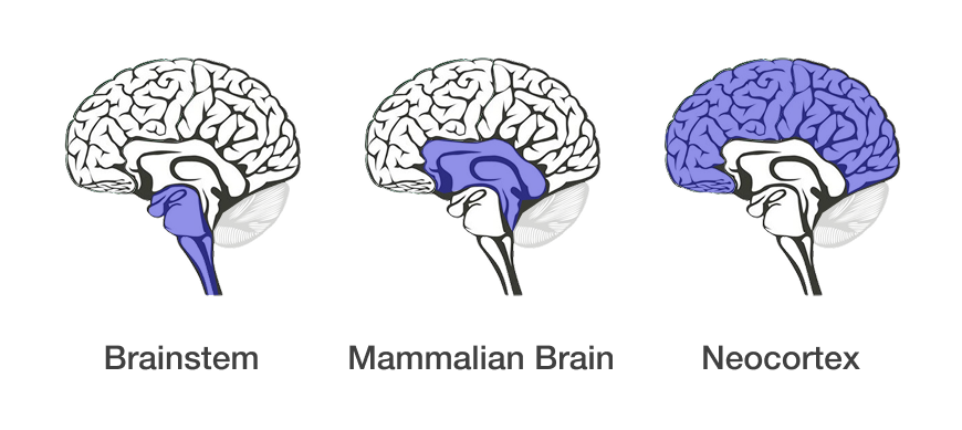 So let’s look at human decision-making, where does it come from? In evolutionary psychology, there’s a theory called the triune brain theory, that says our brain evolved in three stages. The first part is the brain stem, the smallest part at the bottom of the brain responsible for keeping our hearts going, our bloodflow, our breathing, digestion, all the circulation, all the things we can’t consciously control. The next part is called the mammalian brain, similar to the brain of an animal. Finally, the neocortex, which covers up everything (the word cortex literally means ‘cover’).