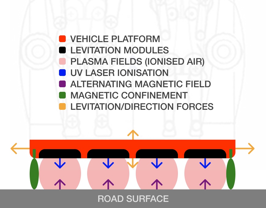 - Levitation Without a Physical Track: a) Traditional maglev works by inducing eddy currents in conductive materials, which provide lift and stability; b) In an open system, the vehicle would need a way to generate, sustain, and dynamically control the plasma beneath it without dissipation or instability; c) Magnetic "bottle" techniques, similar to those in fusion reactors, could help trap plasma, but precise real-time control would be required to prevent drift or collapse; d) Active feedback systems, integrating real-time plasma diagnostics, would be critical for maintaining stability; e) This could involve an array of UV laser emitters and microwave ionisers onboard the vehicle, dynamically adjusting plasma concentration in real time to match velocity and altitude requirements.